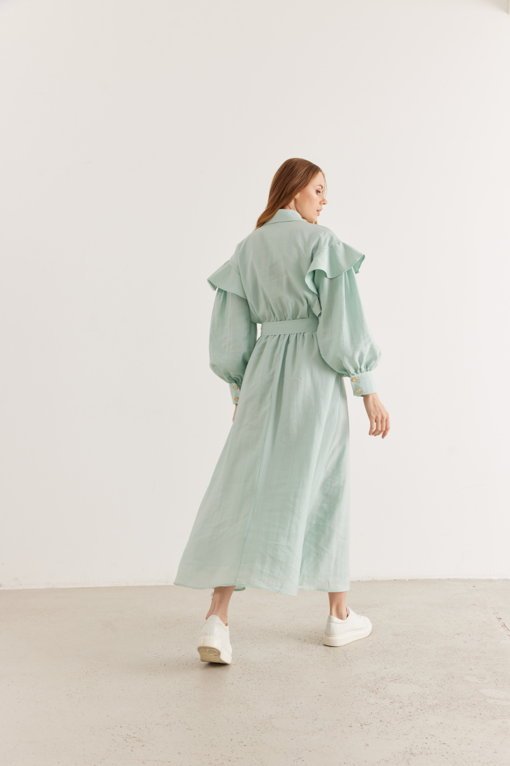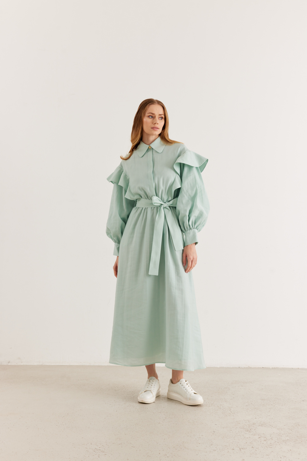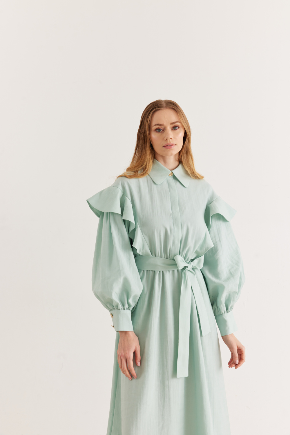 Ürün Detayları: Fırfırlı balon kol, metal düğmeli, bel lastikli bağlama kemerli, astarlı elbise.