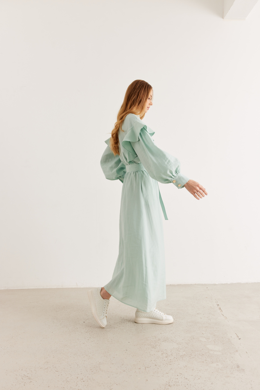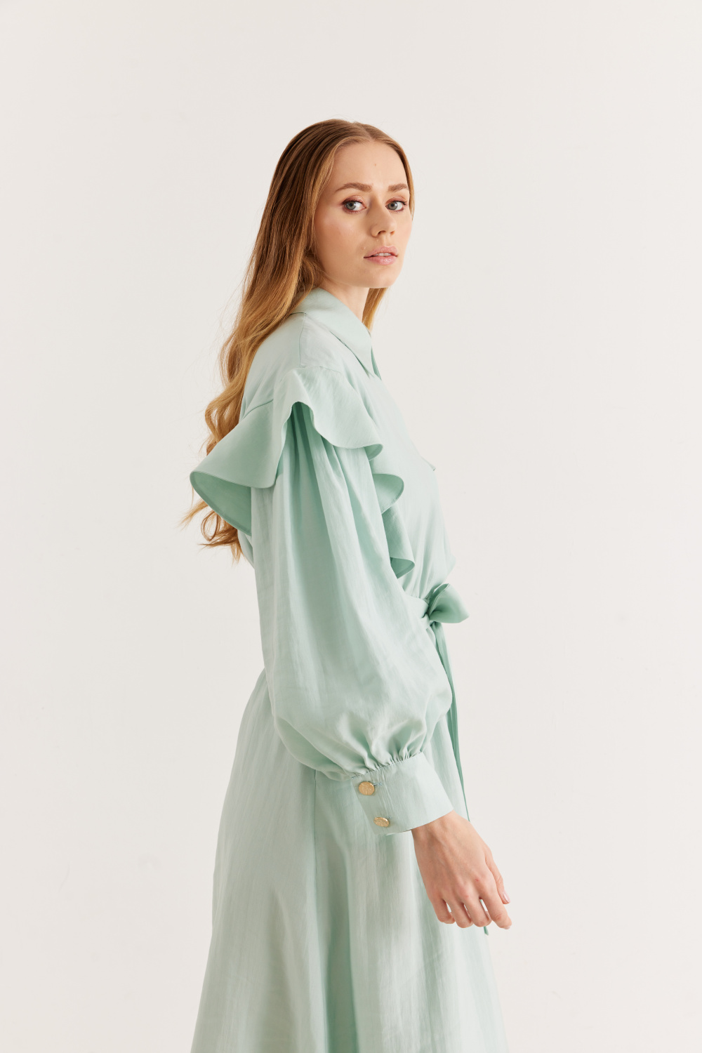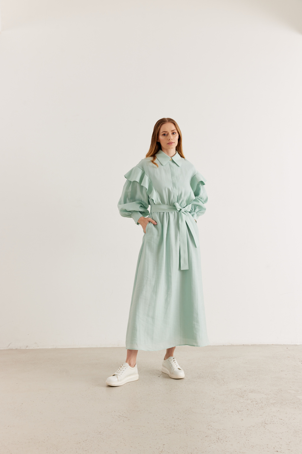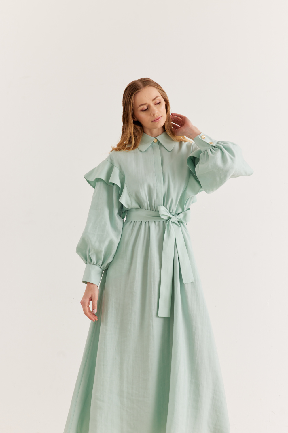 Ürün Detayları: Fırfırlı balon kol, metal düğmeli, bel lastikli bağlama kemerli, astarlı elbise.