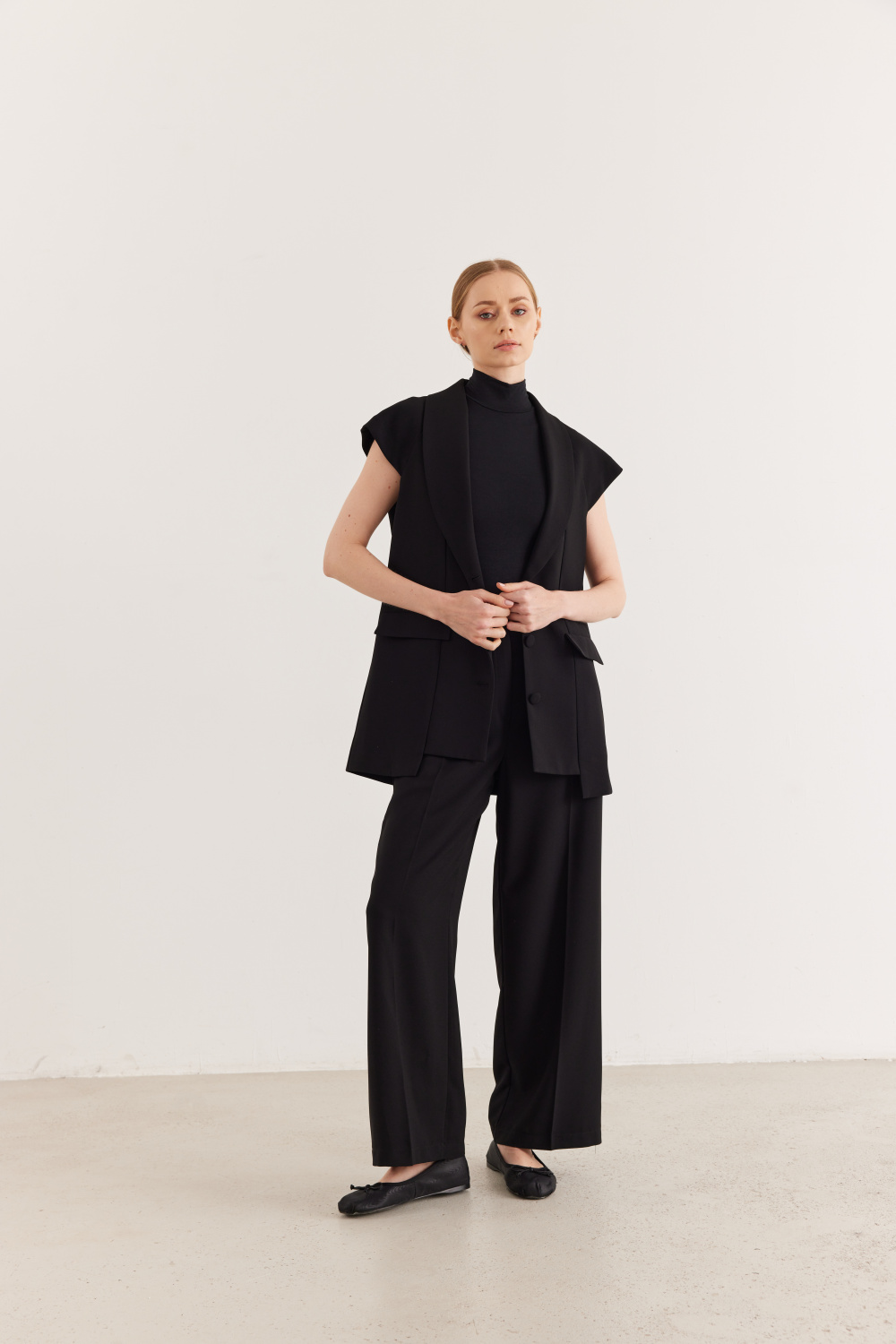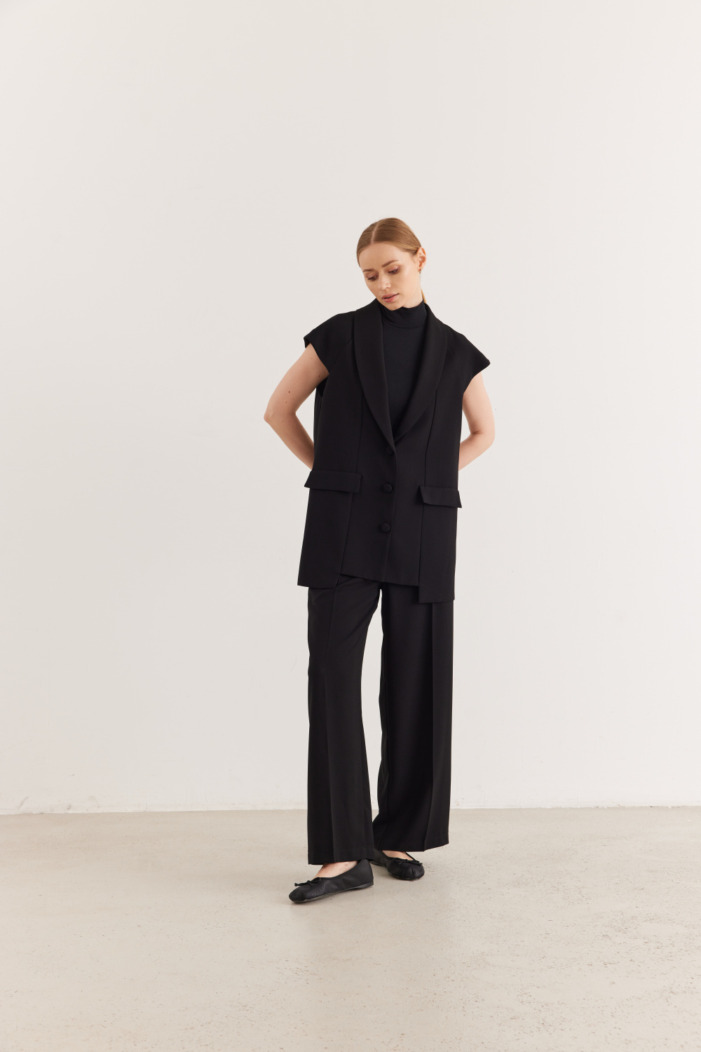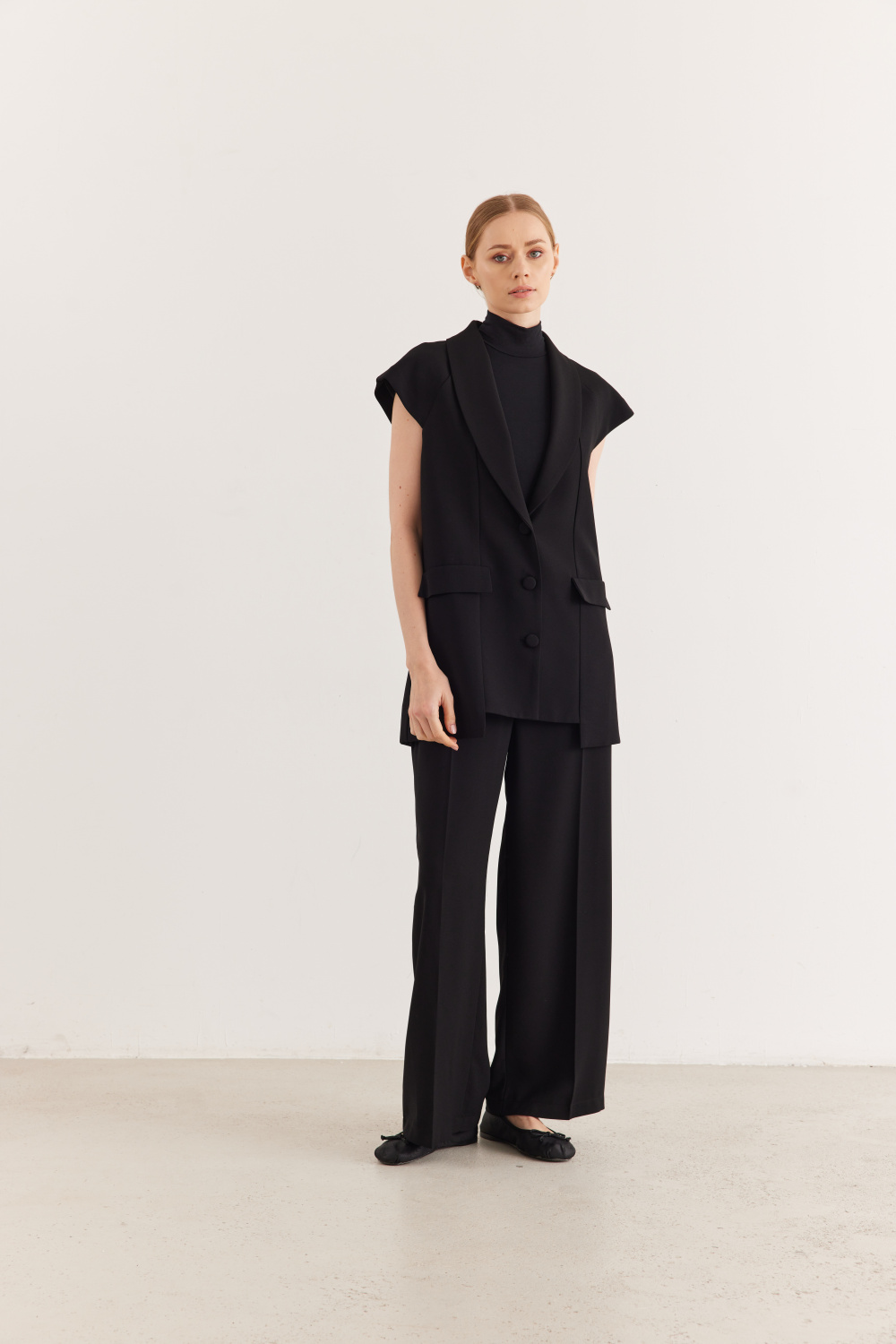 Ürün Detayları: Ön cep detaylı, Şal yakalı, düşük omuz yelek ve arka bel lastikli pantolon.