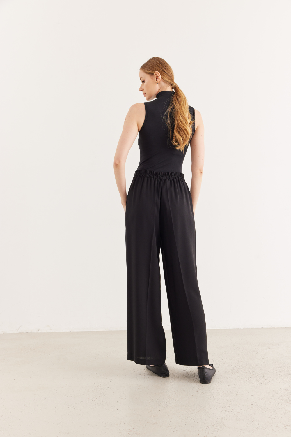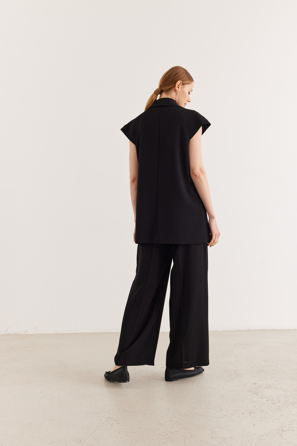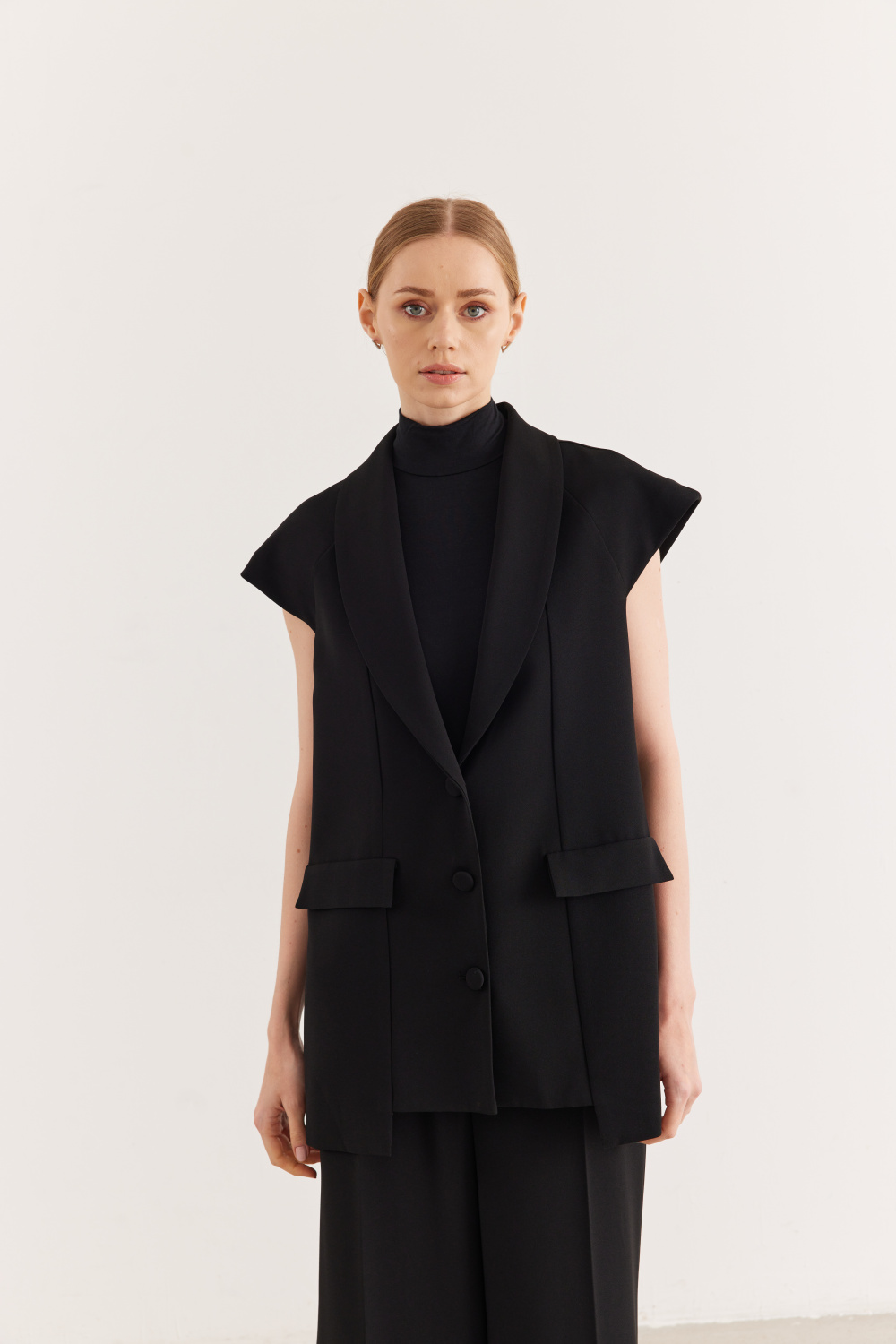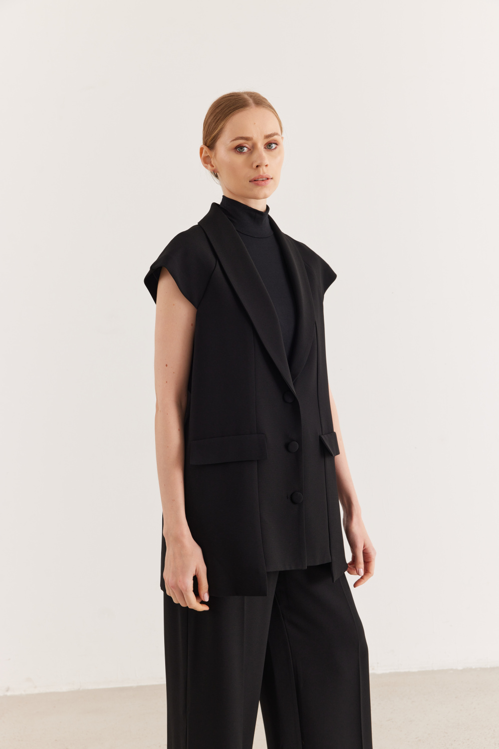Ürün Detayları: Ön cep detaylı, Şal yakalı, düşük omuz yelek ve arka bel lastikli pantolon.