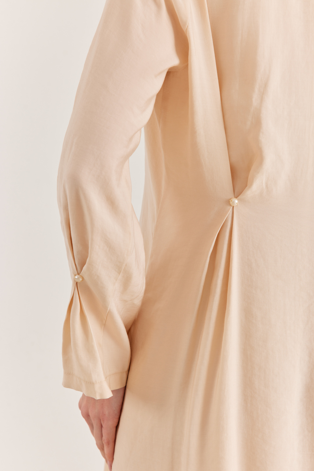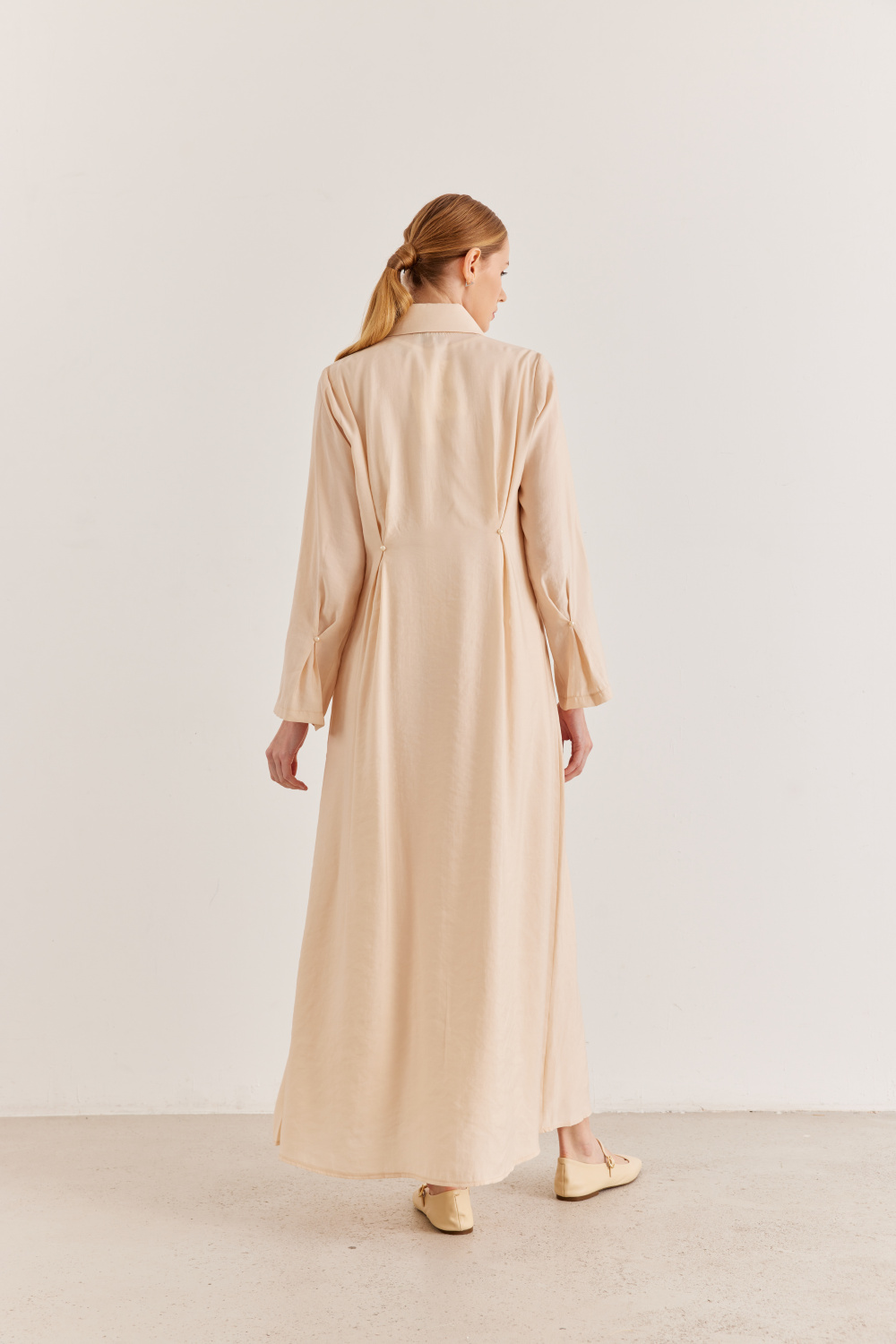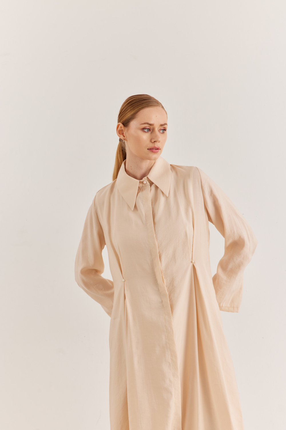 Ürün Detayları: Ön düğme kapamalı, gömlek yakalı, ön, arka, kol inci detaylı rahat kalıp uzun elbise