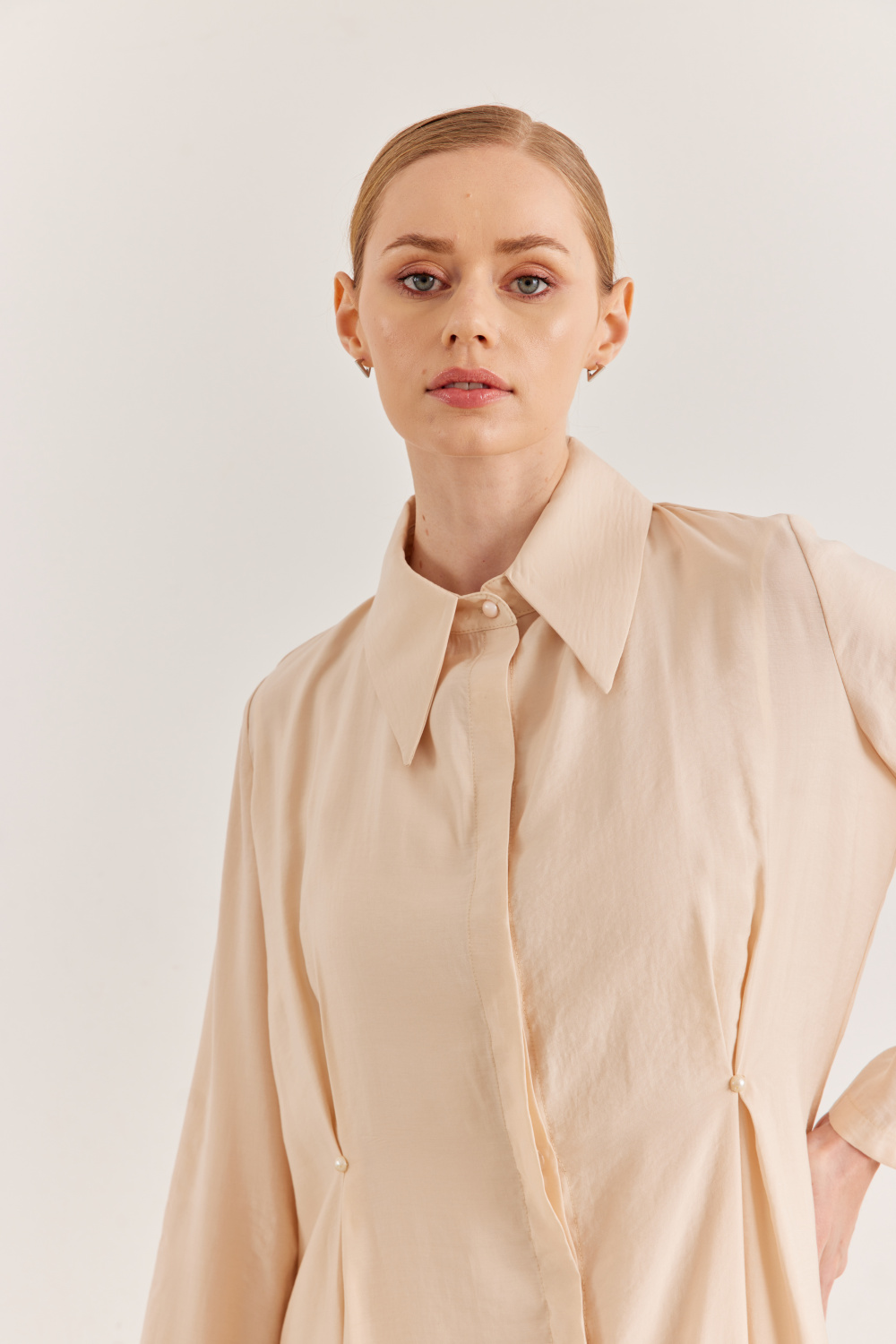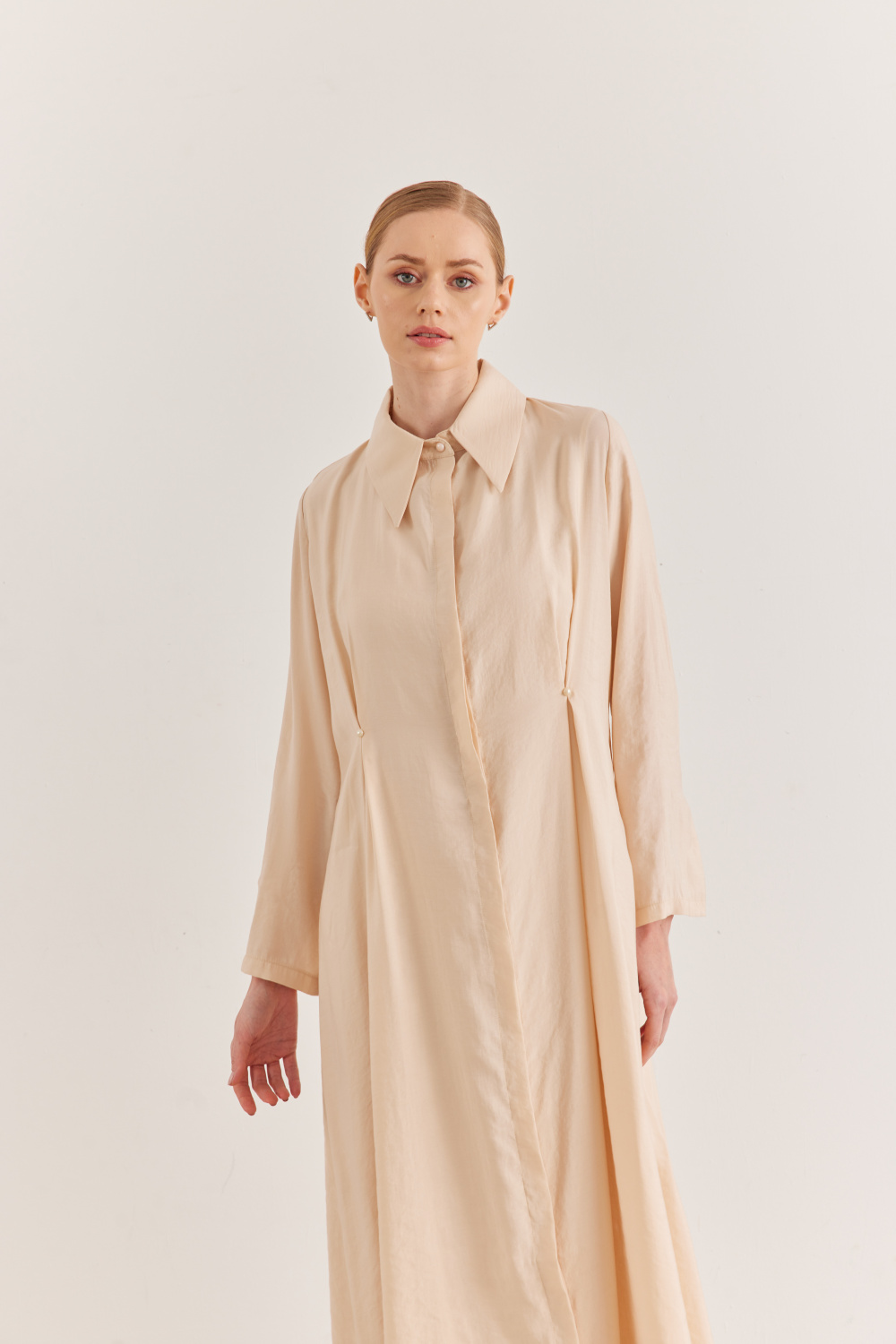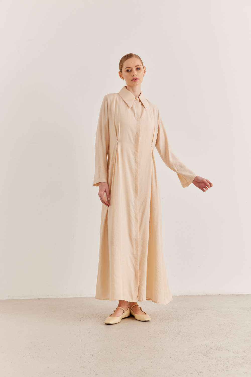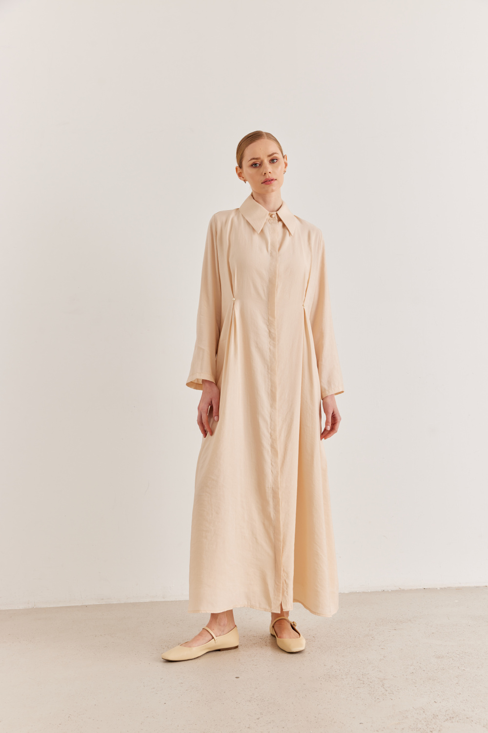 Ürün Detayları: Ön düğme kapamalı, gömlek yakalı, ön, arka, kol inci detaylı rahat kalıp uzun elbise