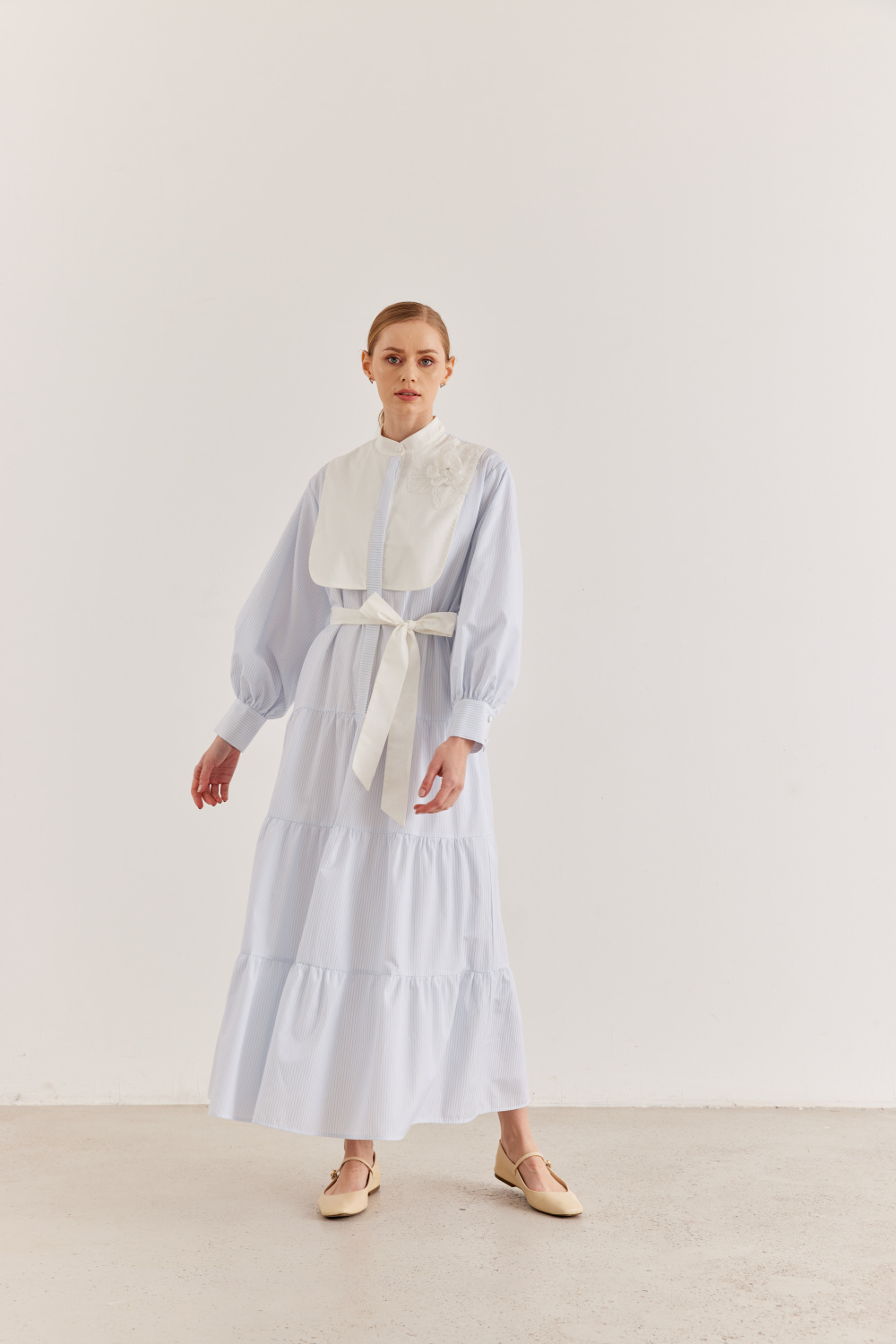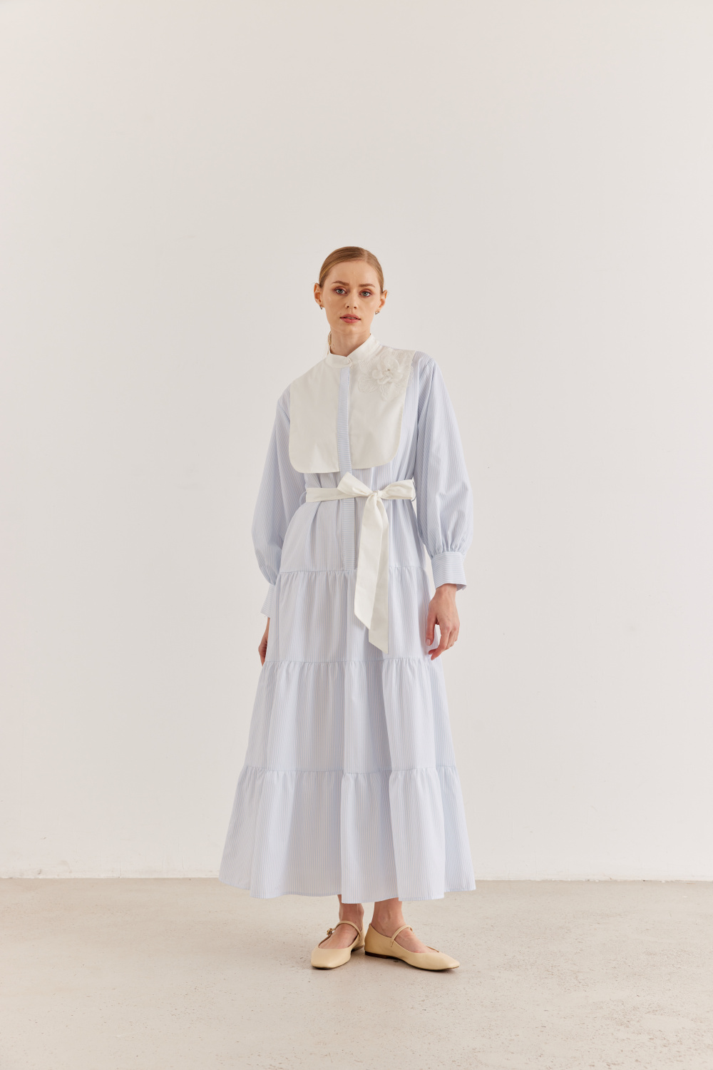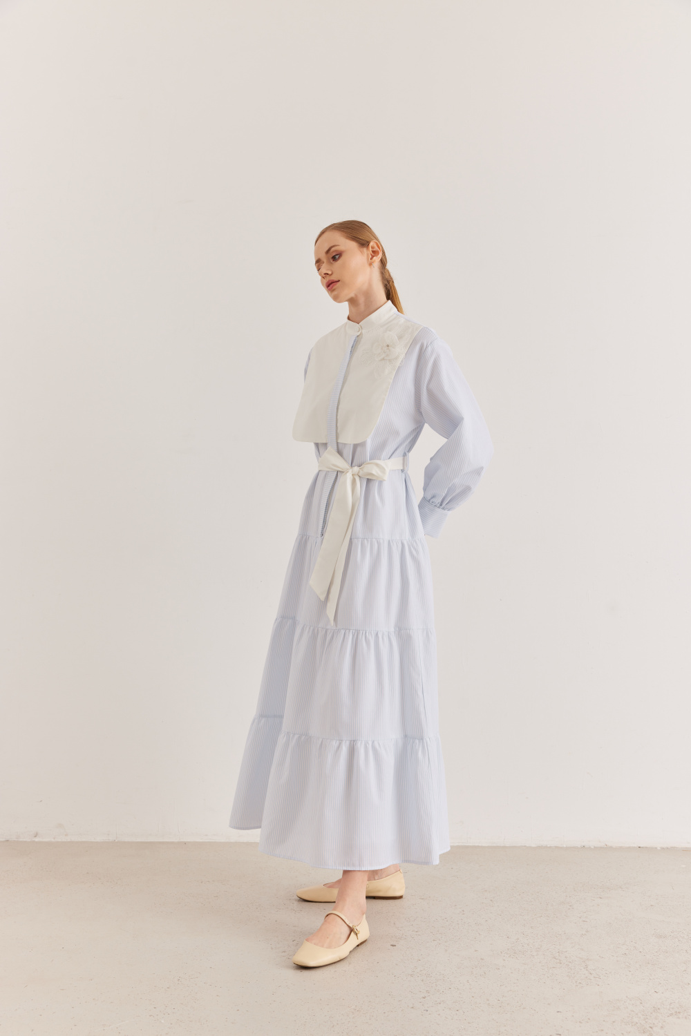 Ürün Detayları: Çiçek detaylı, çizgili desenli, kat büzgülü, astarlı elbise.Ürün Ölçüleri: Ön omuzdan boy 136 cm.