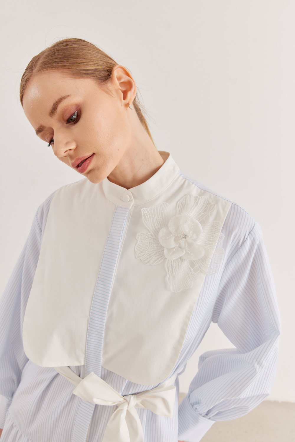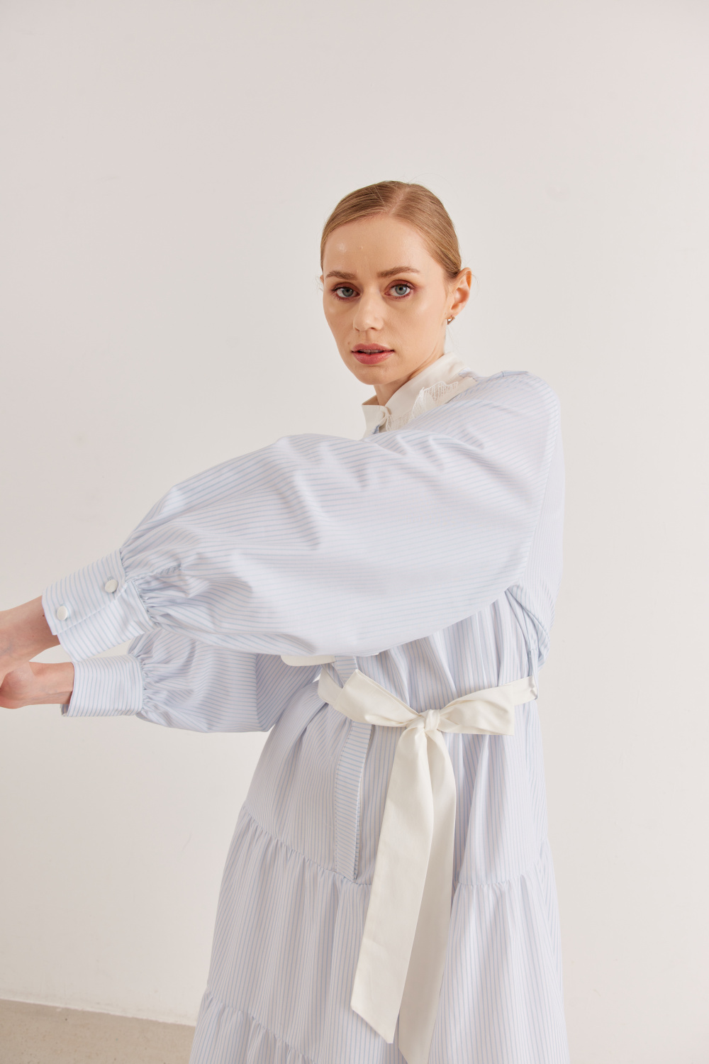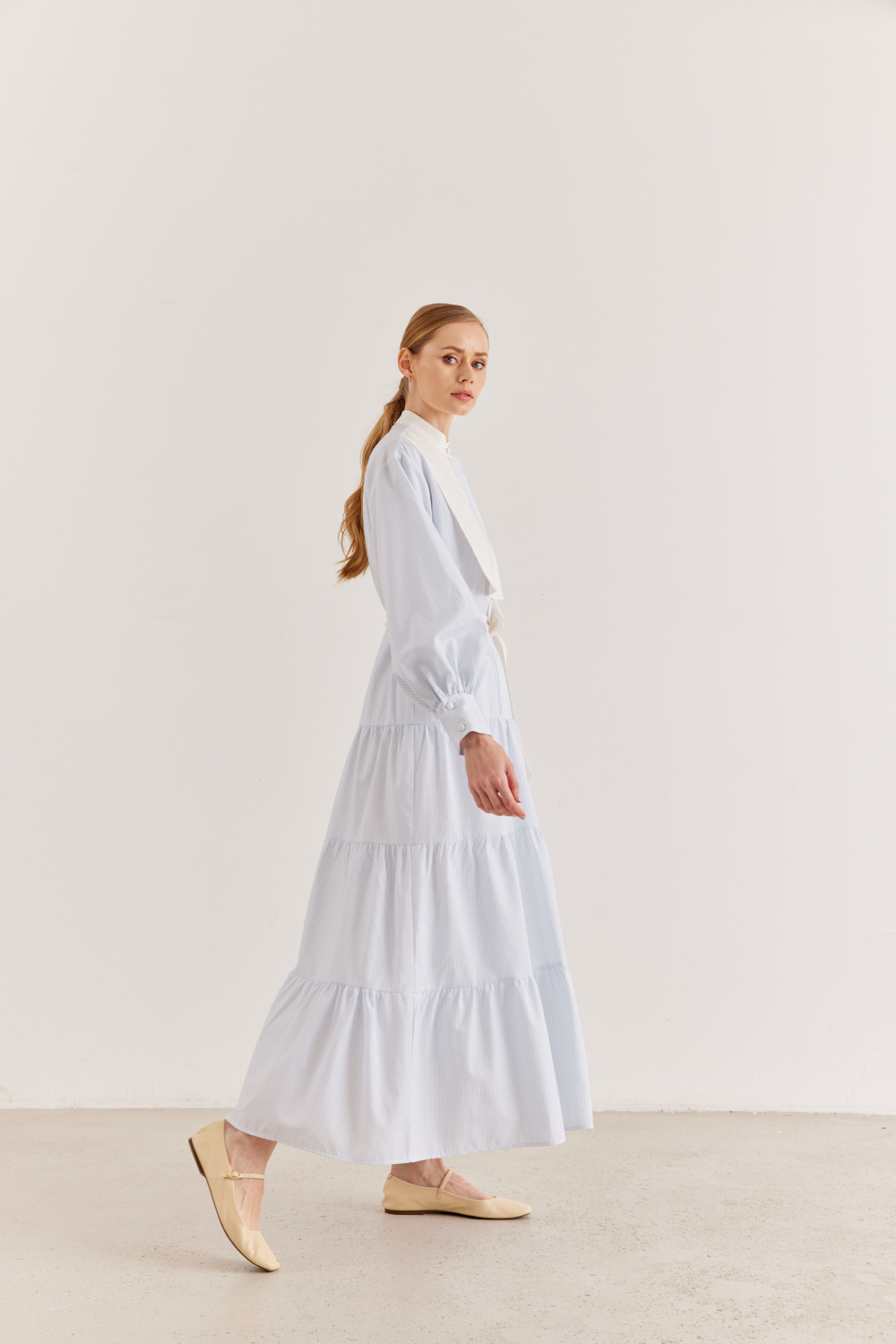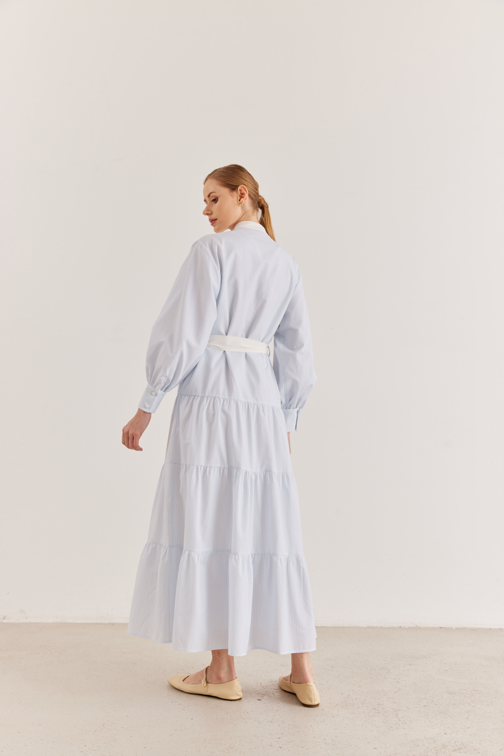 Ürün Detayları: Çiçek detaylı, çizgili desenli, kat büzgülü, astarlı elbise.Ürün Ölçüleri: Ön omuzdan boy 136 cm.