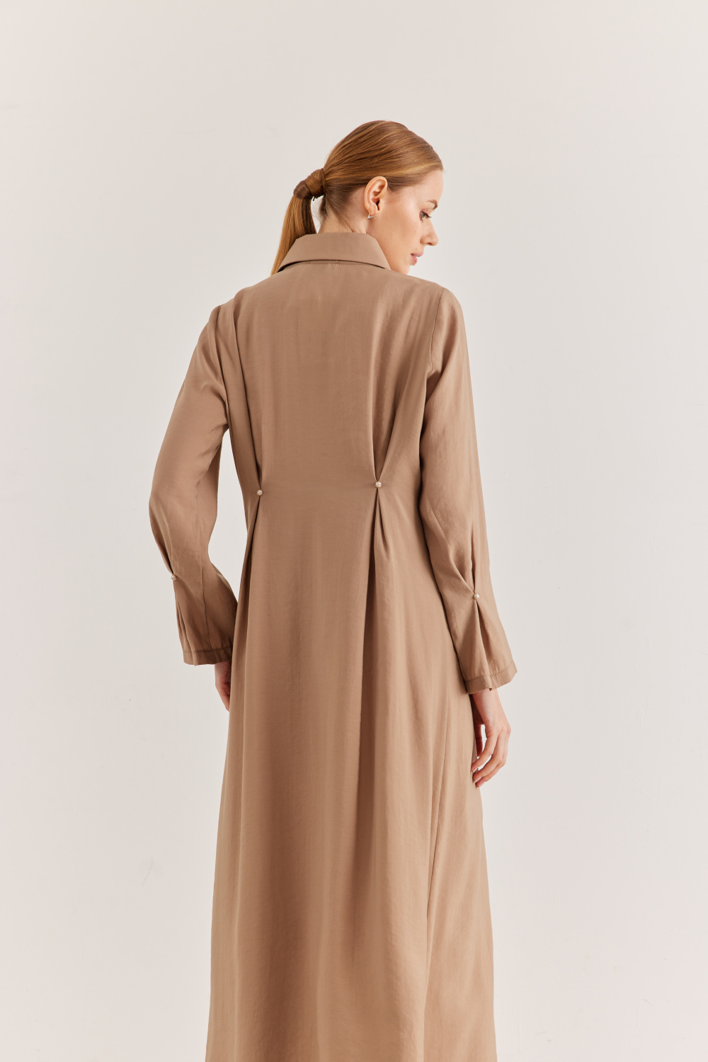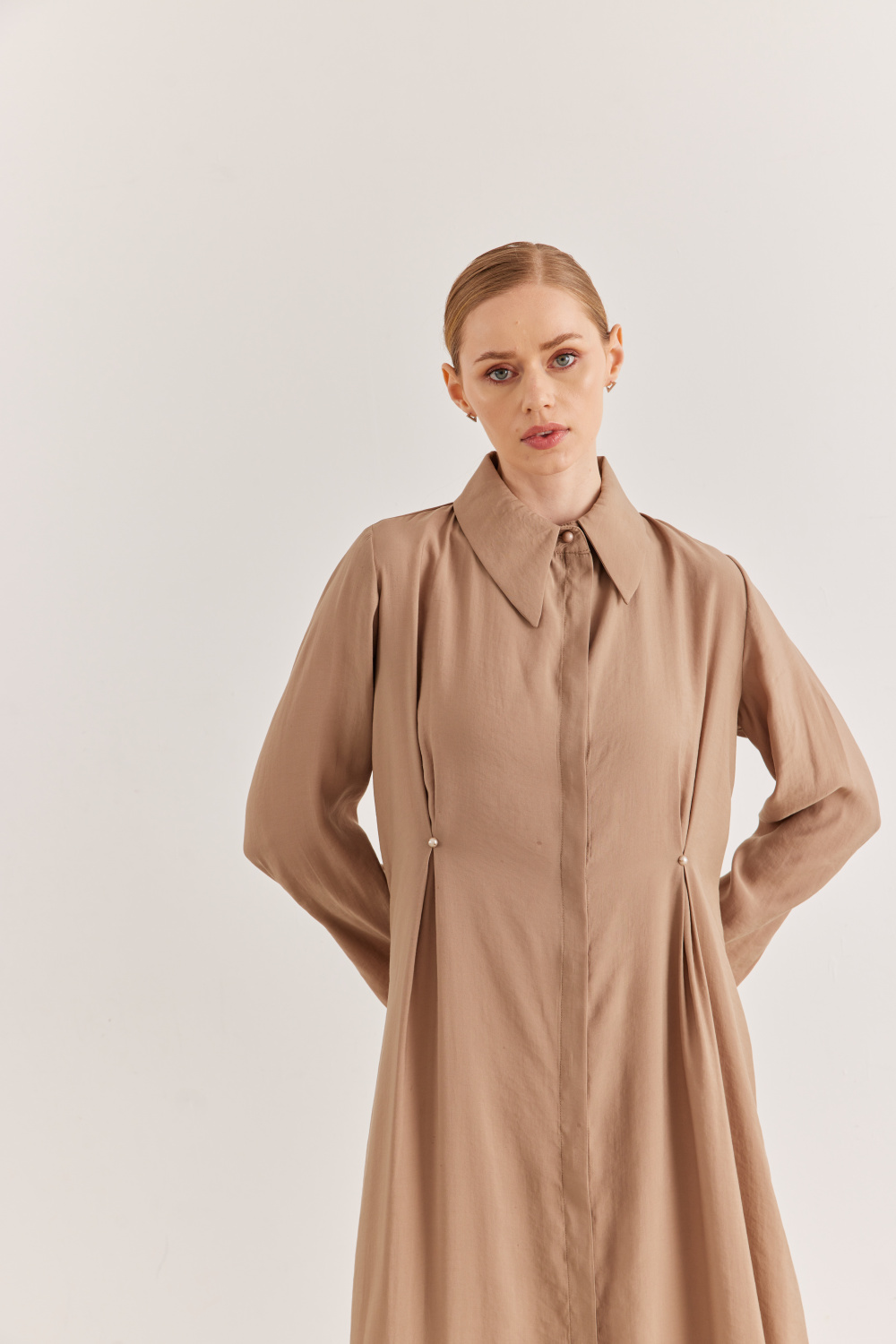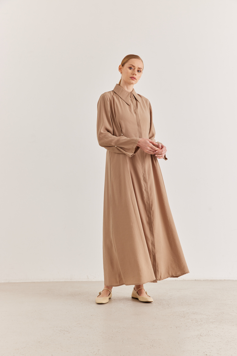 Ürün Detayları: Ön düğme kapamalı, gömlek yakalı, ön, arka, kol inci detaylı rahat kalıp uzun elbise