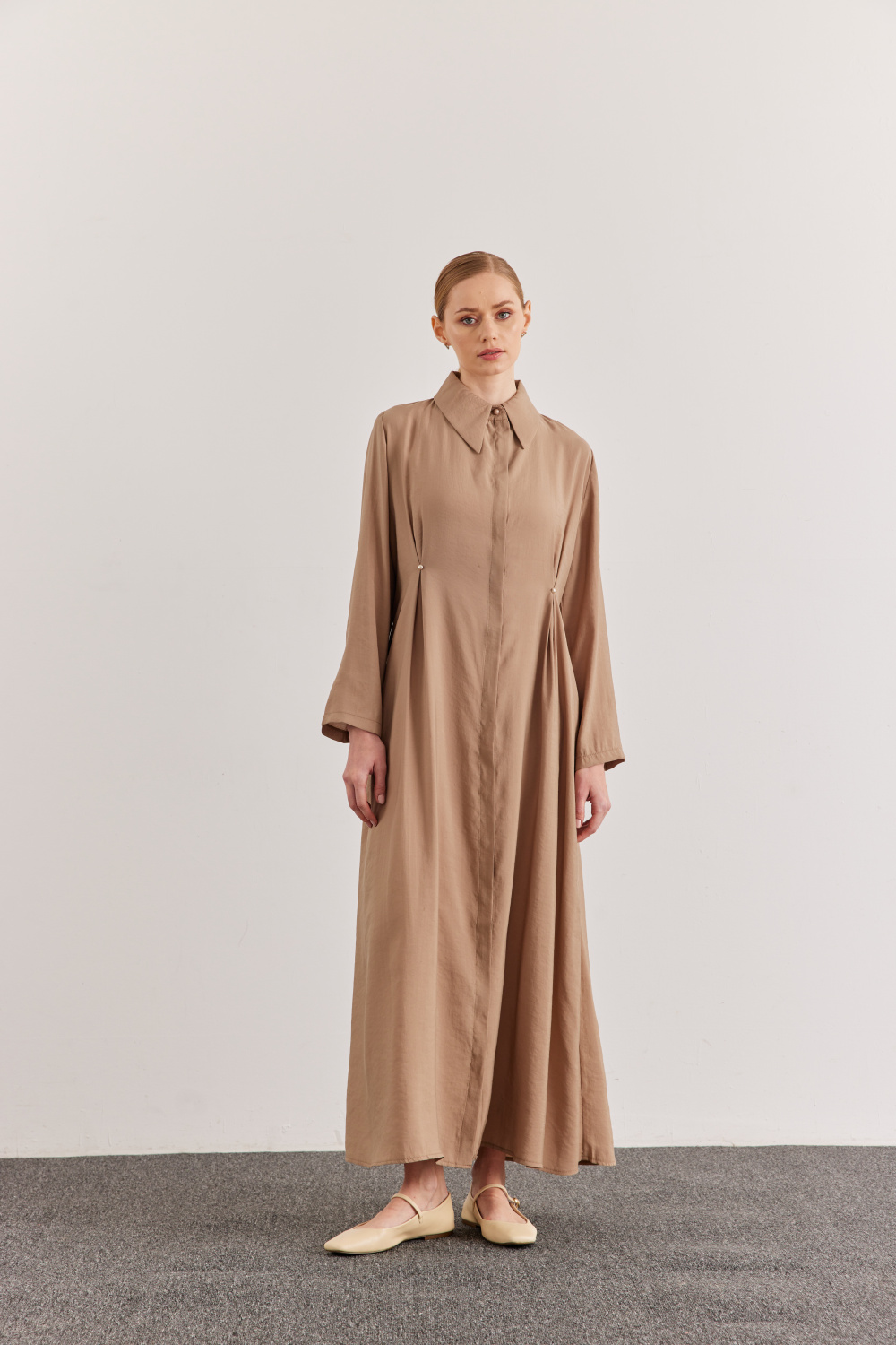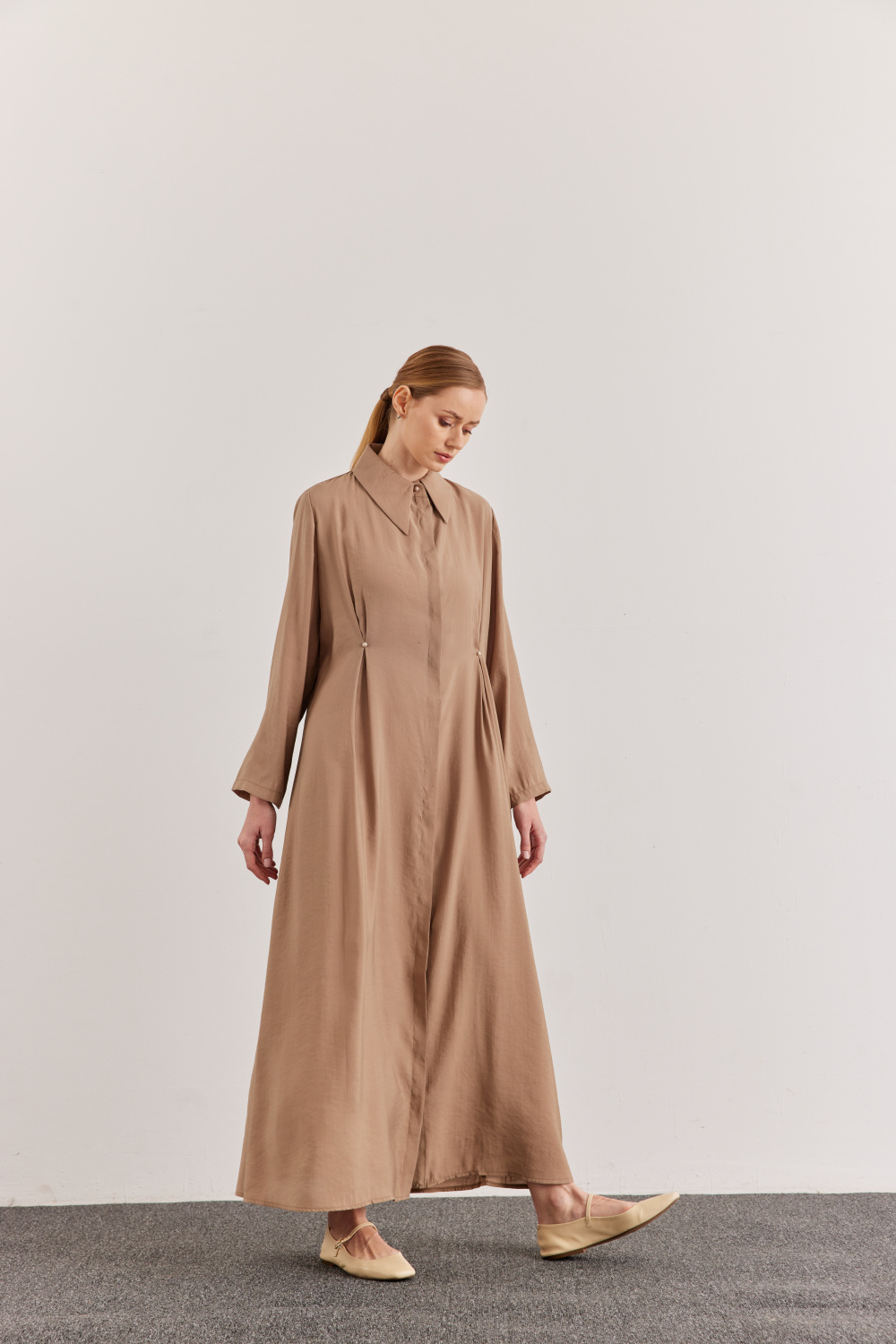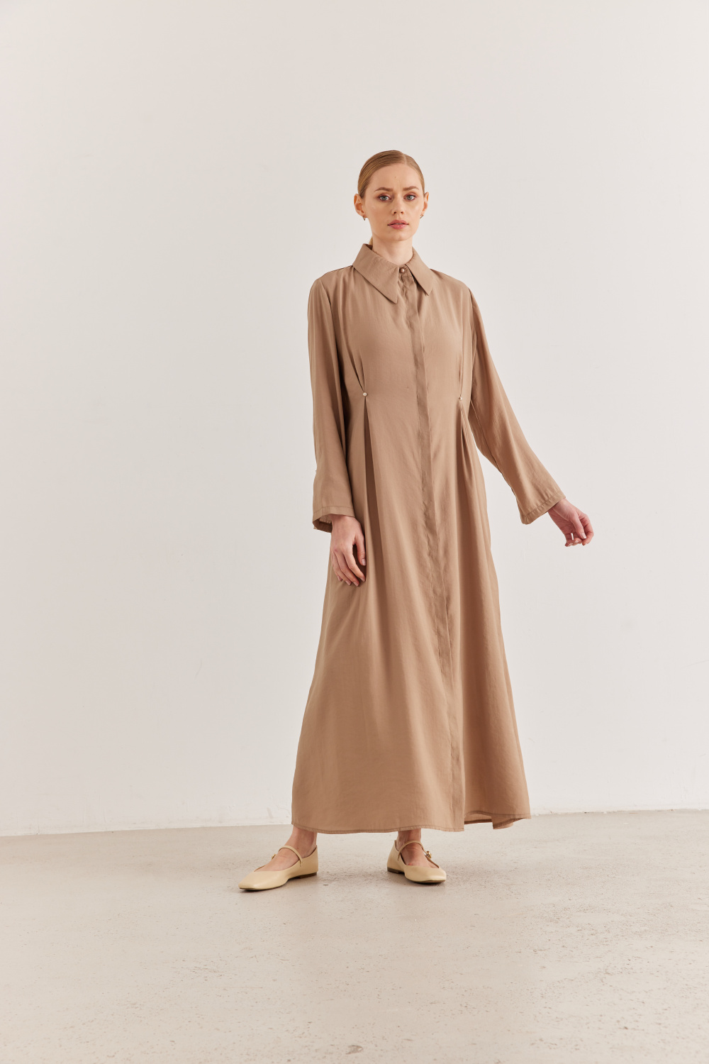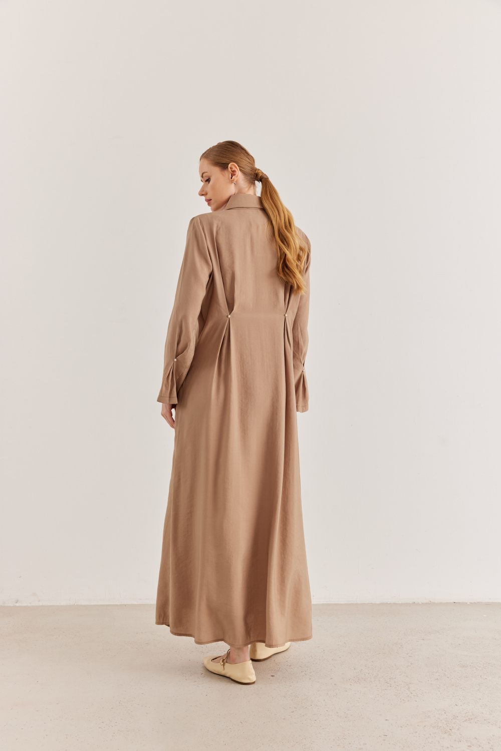Ürün Detayları: Ön düğme kapamalı, gömlek yakalı, ön, arka, kol inci detaylı rahat kalıp uzun elbise