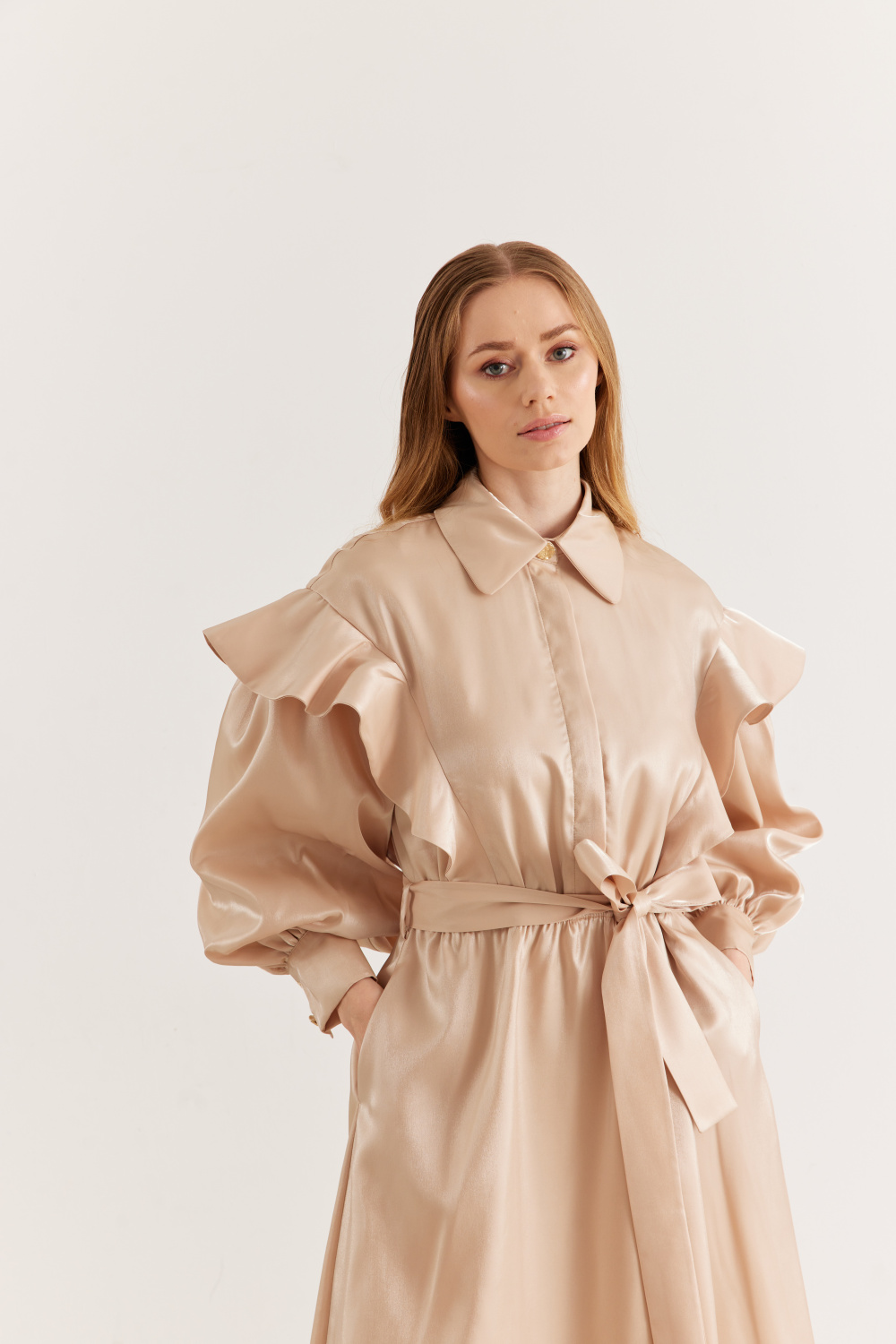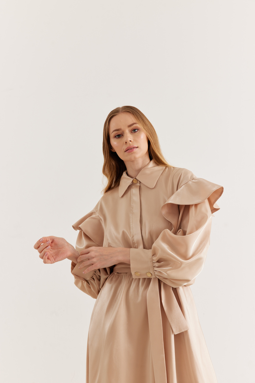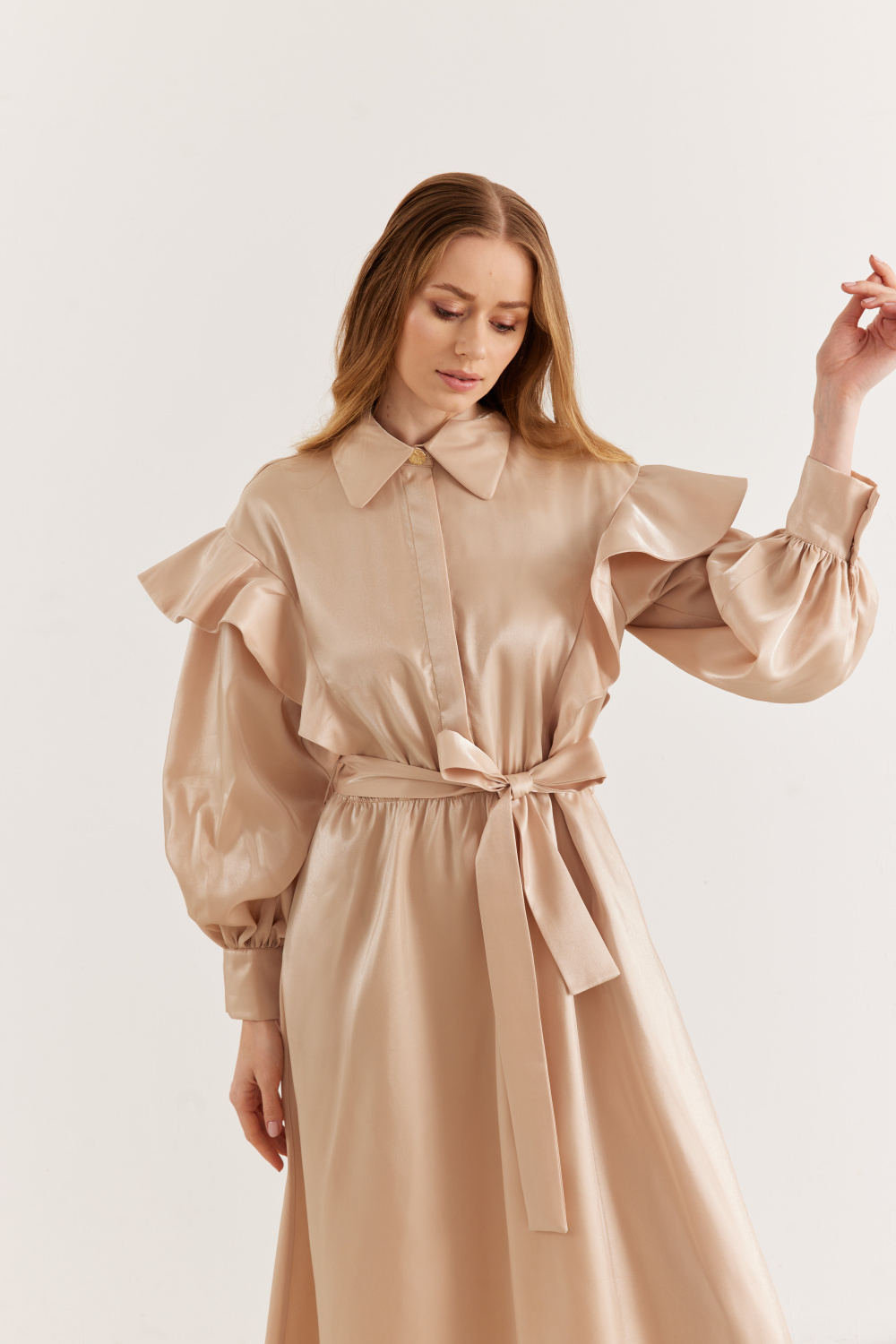 Ürün Detayları: Fırfırlı balon kol, metal düğmeli, bağlama kemerli, parlak kumaş şık görünümlü astarlı