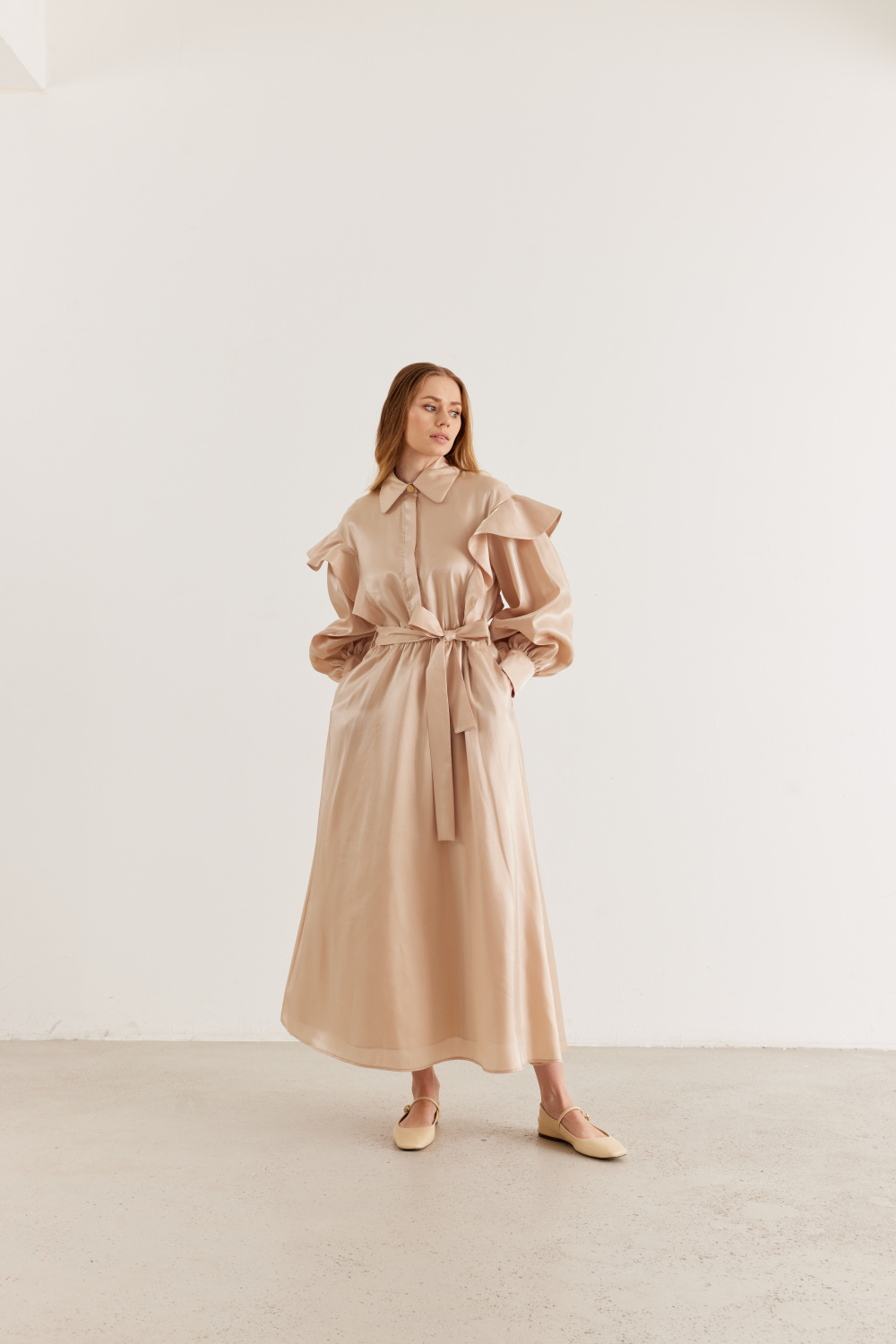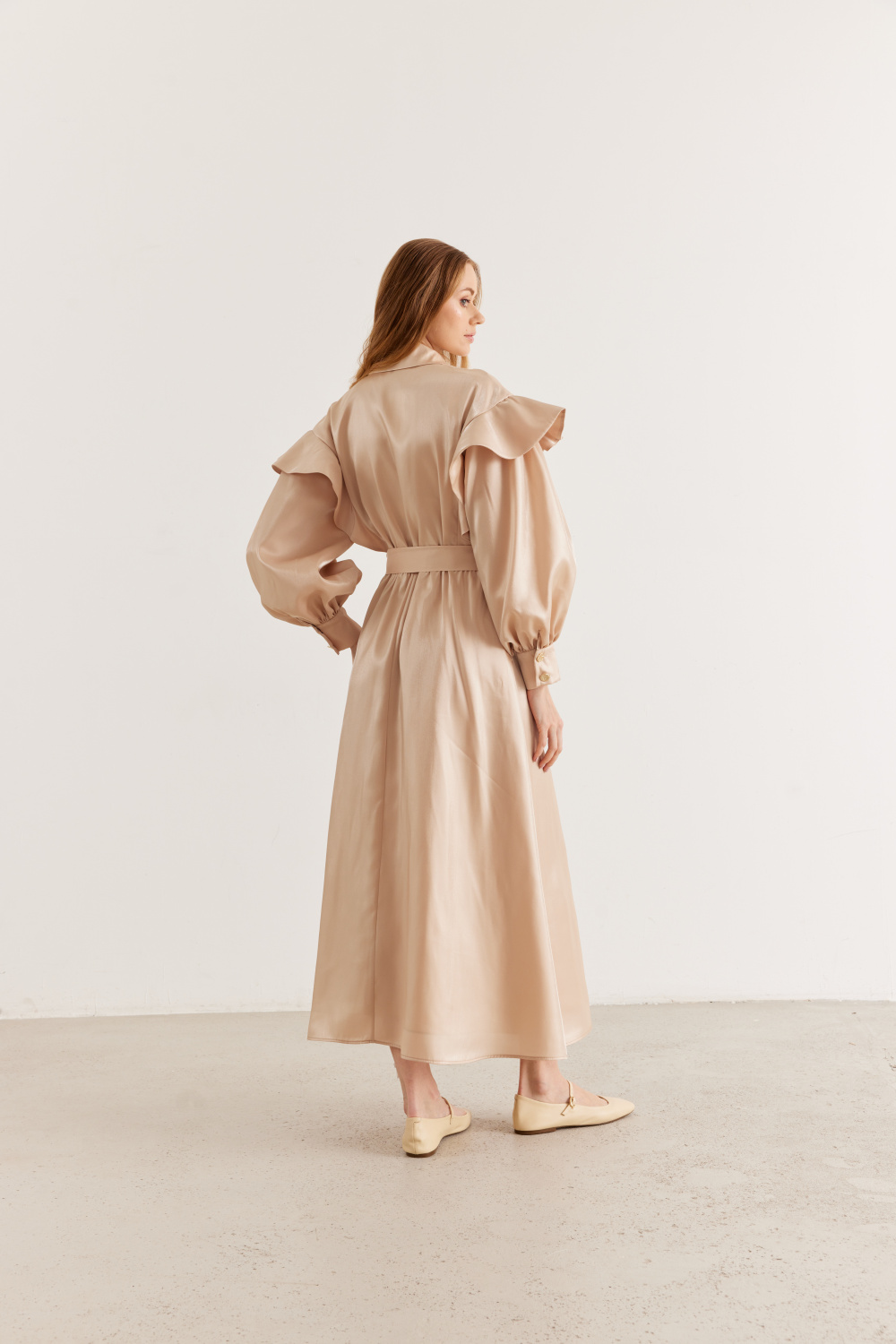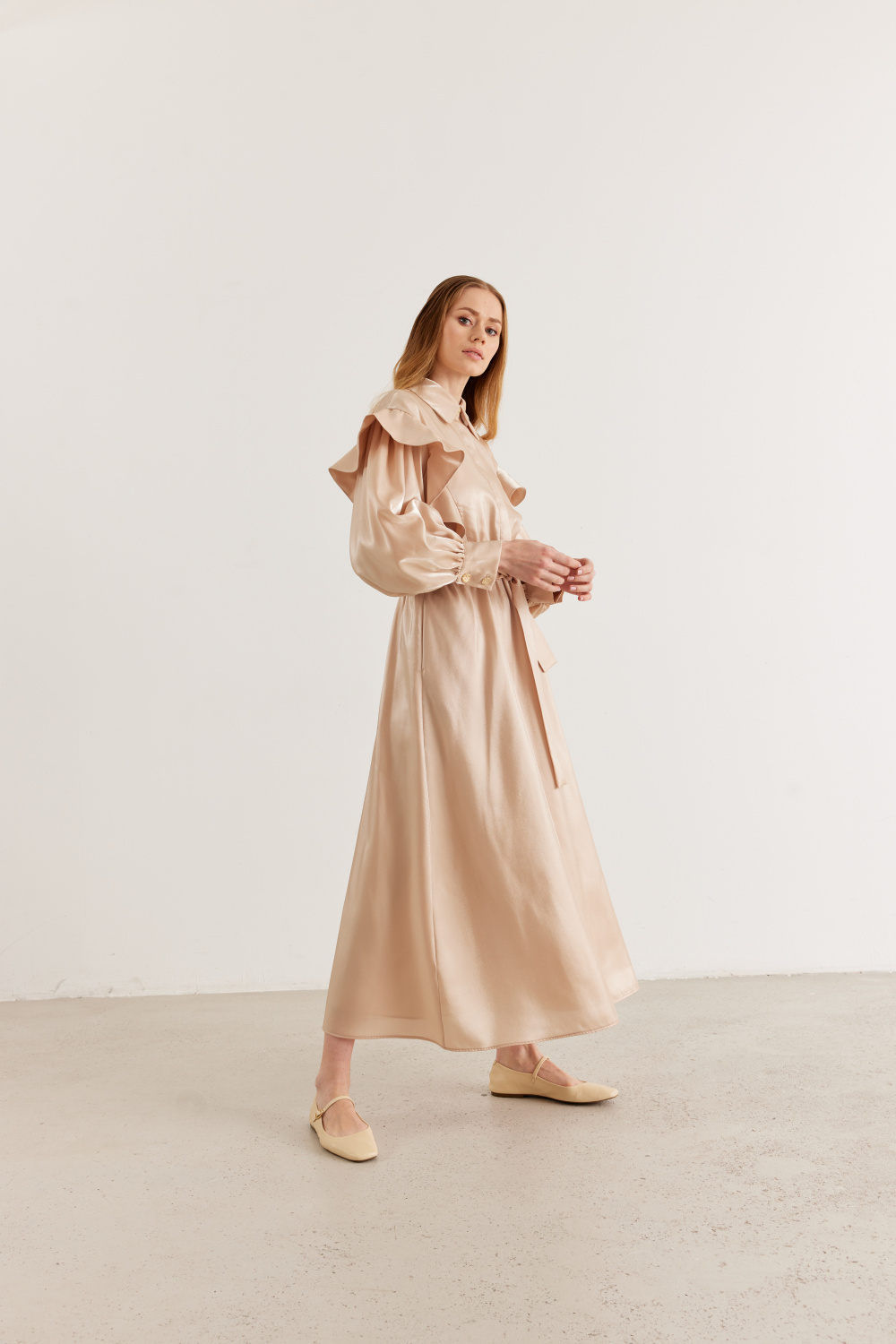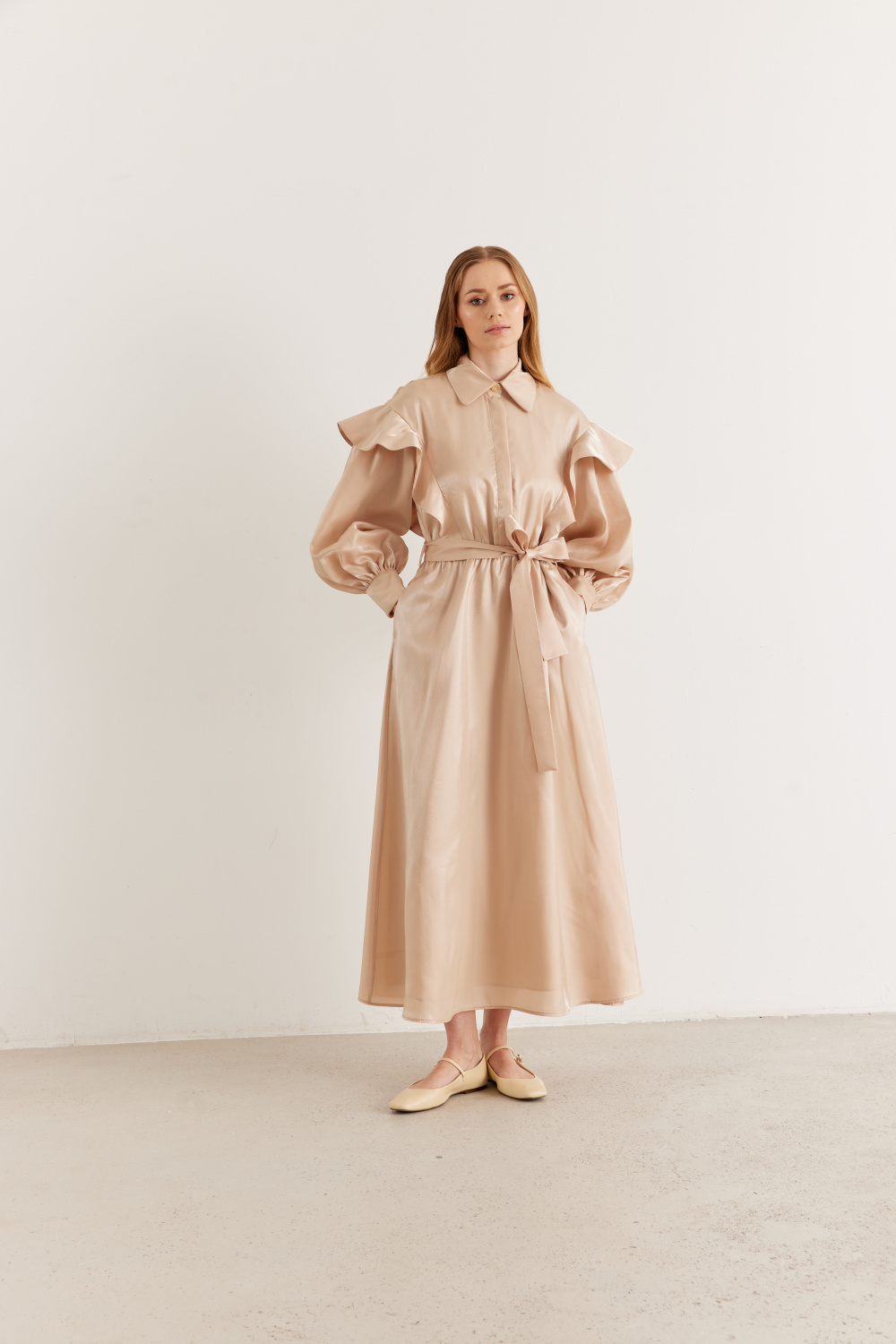 Ürün Detayları: Fırfırlı balon kol, metal düğmeli, bağlama kemerli, parlak kumaş şık görünümlü astarlı